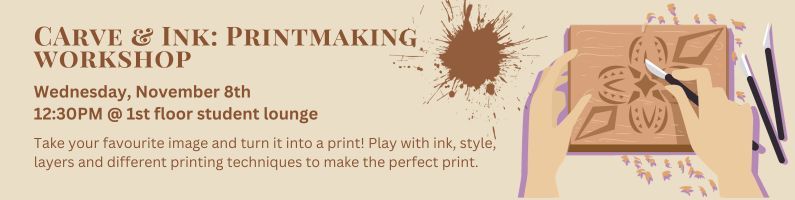 Play with ink, style, layers and different printing techniques to make the perfect print. Join advisor Yansi in the first floor lounge on Wednesday, November 8th, at 12:30 PM with your imagination. No previous experience is needed, all tools will be provided on-site!