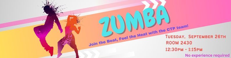Join the CTP team to get moving with a Zumba session on Tuesday, September 26th, RM 2430 from 12:30 – 1:15 PM!  Take a break and try out Zumba, led by the FIC Orientation Team! No experience necessary, everyone is welcome!