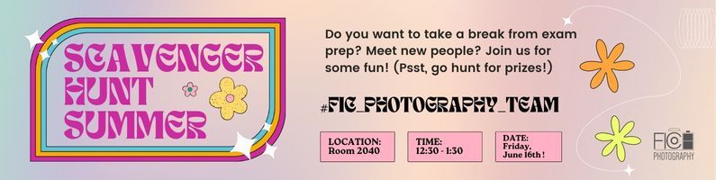 Join FIC Photography Team in an adventure to find and take pictures of different objects hidden around FIC, complete tasks, and compete with your team to win a prize!