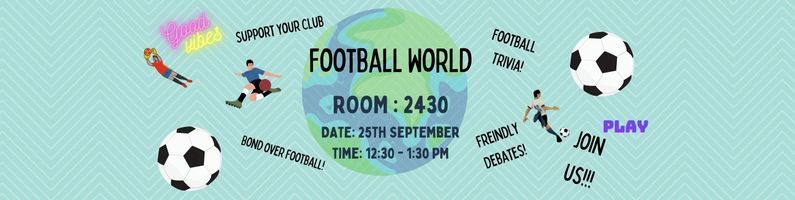 Welcome to “Football World,” where the love for football brings students together to connect, engage in football trivia, support their favorite clubs, make new friends, and form lasting bonds over their shared passion for the sport. Join the event on September 25th from 12:30 to 1:30 PM at RM2430!