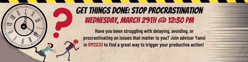 Don’t know where to start your work? Feeling overwhelmed about your classes or life in general? Learn to stop the habit of procrastination and ease your stress level with health study tips. Join us on Wednesday, March 29th at 12:30PM in RM2030. Share your secret methods with us and find your study groups here!