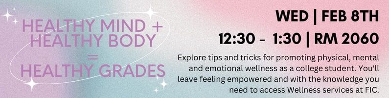 Did you know that your mental and physical health may impact your grades? Are you interested in knowing how this happens and what you can do to boost your health and your grades? Join this workshop hosted by the FIC Wellness team to learn more and to access the Wellness services at FIC on Wednesday, February 8th from 12:30-1:30pm in Room 2060.