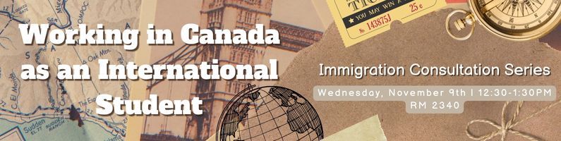 This session will be about Working in Canada as an International Student. If you are interested on attending, have questions about working in Canada or would like to just go to listen, join the in-person workshop on Wednesday, November 9th from 12:30 to 1:30pm RM2340