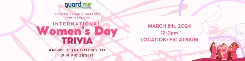 Did you know, International Women’s Day is a combined celebration with Mother’s Day in many places around the world!! Participate in IWD Trivia hosted by Guard.me and win amazing prizes! Happening on Wednesday, March 8th from 12-2pm at the FIC Atrium. See you there!