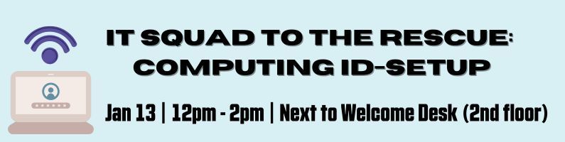Wondering how to setup your computing ID? Visit IT Squad by the Welcome Desk (2nd floor).