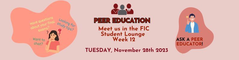Week 12 is the last week of Peer Education! Join this Tuesday between 12:00-2:00pm to get support from experienced FIC students and alumni.