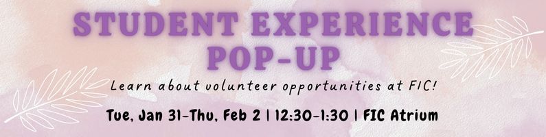 These pop-up events will be happening in the FIC Atrium (1st floor) from 12:30-1:3pm all 3 days.