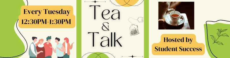 Tea and Talk sessions are held every Tuesday at 12:30 PM – 1:30 PM. Come practice your English with us, take a break from your class and connect with your friends in a safe, diverse, and inclusive space!