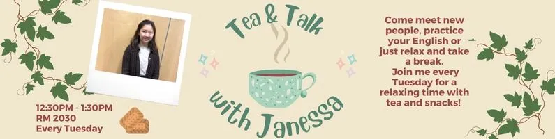Come meet new people, practice your English or just relax and take a break. Join Janessa every Tuesday for a relaxing time with tea and snacks! Room 2030, 12:30 – 1:30pm.