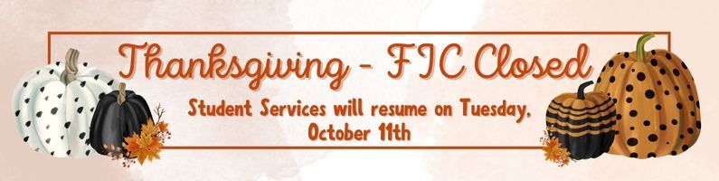 FIC is closed for the Thanksgiving Holiday. Student Services will resume on October 11th.
