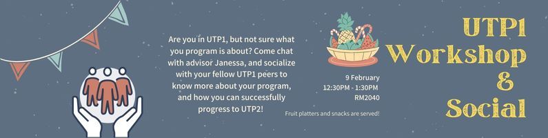 Feeling confused about UTP1? What courses you need to take? Do you want to meet people that are going through the same program as you? Advisor Janessa is hosting a UTP1 workshop and social where you can know more about your program, and how you can successfully move from UTP1 to UTP2!